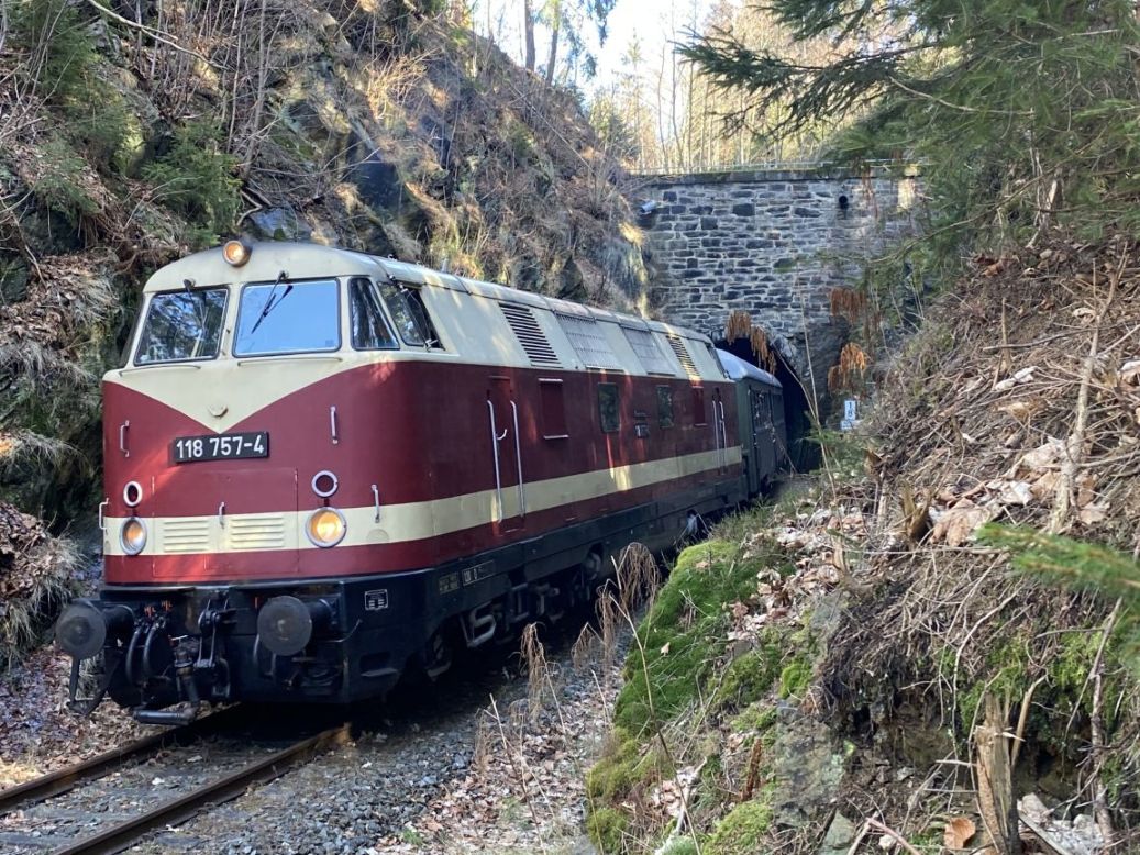 Initiiert von Freunden des EISENBAHNFREUNDESKREIS Westsachsen Böhlen/ Großsteinberg, in dem auch der Verfasser dieser Zeilen seine Tür zum Hobby Eisenbahn geöffnet bekam, ging es am Samstag, den 28.02.2026, auf eine vorerst letzte Sonderfahrt mit dem letzten erhaltenen LOWA E5 Wagen. Ziel war es, im Rahmen einer exklusiven Zugfahrt weitere Spenden für die anstehenden umfangreichen Restaurationsarbeiten inklusive Blecharbeiten, am E5 Wagen einzuwerben. Bei schönstem Frühlingswetter ging es mit dem Sonderzug, gezogen von der 118 757-4 der Eisenbahnbau- und Betriebs- Gesellschaft Pressnitztalbahn GmbH (PRESS), von Schwarzenberg aus über Schlettau, Annaberg-Buchholz und Cranzahl bis nach Bärenstein. Auf dem Weg nach Bärenstein ergab sich die seltene Möglichkeit, den Zug am Tunnel Kühberg fotografisch in Szene setzen zu können. Diese Fotostelle blieb den mitreisenden Fahrgästen vorbehalten und lässt sich in dieser Form nicht alle Tage umsetzen. Auf dem Rückweg ging es über Cranzahl nach Wolkenstein, wo uns Familie Reuter des Wolkensteiner Zughotels im Nostalgiecafe „Alter Bahnmeister“ auf dem wunderschönen Freisitz am Bahnhofsgebäude zu Mittag bewirtet hat. Anschließend führte die Fahrt über die BSg zurück nach Schwarzenberg und ein wunderschöner, erlebnisreicher Eisenbahntag ging zu Ende. Im Rahmen der Sonderfahrt konnten weitere Spenden in Höhe von ca. 3.300 € für das Projekt eingeworben werden. Mein herzlicher Dank hierfür gilt allen Spendern und Unterstützern. Weiterhin möchte ich mich darüber hinaus bei meinen Freunden Reinfried Polter und Lutz Mehlhorn für die Organisation wesentlicher Punkte der Fahrt bedanken, bei der PRESS für die unkomplizierte Durchführung der Fahrt, bei der DB Erzgebirgsbahn für die Erfüllung unserer Fahrplanwünsche, beim Zugführer Michael Ganzenberg für die Begleitung und dem Wolkensteiner Zughotel für die Gastfreundschaft zu unserem Mittagsimbiss.