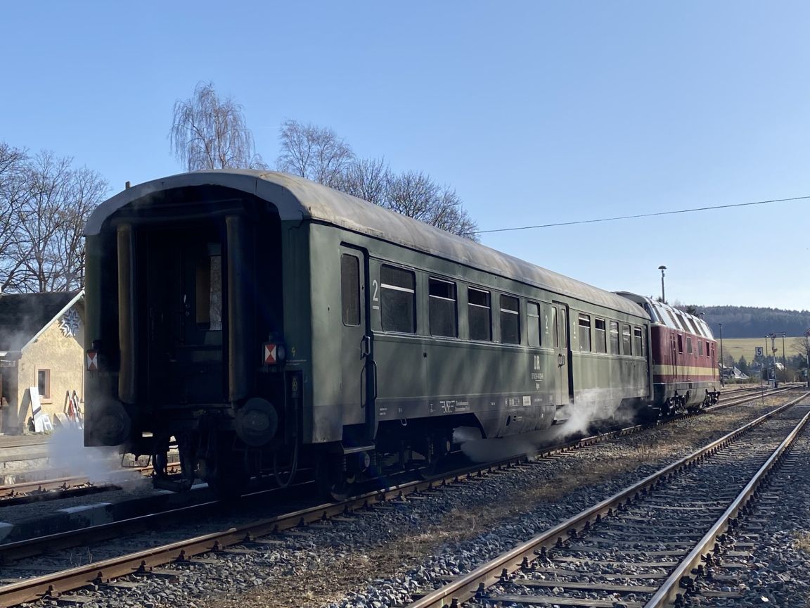 Initiiert von Freunden des EISENBAHNFREUNDESKREIS Westsachsen Böhlen/ Großsteinberg, in dem auch der Verfasser dieser Zeilen seine Tür zum Hobby Eisenbahn geöffnet bekam, ging es am Samstag, den 28.02.2026, auf eine vorerst letzte Sonderfahrt mit dem letzten erhaltenen LOWA E5 Wagen. Ziel war es, im Rahmen einer exklusiven Zugfahrt weitere Spenden für die anstehenden umfangreichen Restaurationsarbeiten inklusive Blecharbeiten, am E5 Wagen einzuwerben. Bei schönstem Frühlingswetter ging es mit dem Sonderzug, gezogen von der 118 757-4 der Eisenbahnbau- und Betriebs- Gesellschaft Pressnitztalbahn GmbH (PRESS), von Schwarzenberg aus über Schlettau, Annaberg-Buchholz und Cranzahl bis nach Bärenstein. Auf dem Weg nach Bärenstein ergab sich die seltene Möglichkeit, den Zug am Tunnel Kühberg fotografisch in Szene setzen zu können. Diese Fotostelle blieb den mitreisenden Fahrgästen vorbehalten und lässt sich in dieser Form nicht alle Tage umsetzen. Auf dem Rückweg ging es über Cranzahl nach Wolkenstein, wo uns Familie Reuter des Wolkensteiner Zughotels im Nostalgiecafe „Alter Bahnmeister“ auf dem wunderschönen Freisitz am Bahnhofsgebäude zu Mittag bewirtet hat. Anschließend führte die Fahrt über die BSg zurück nach Schwarzenberg und ein wunderschöner, erlebnisreicher Eisenbahntag ging zu Ende. Im Rahmen der Sonderfahrt konnten weitere Spenden in Höhe von ca. 3.300 € für das Projekt eingeworben werden. Mein herzlicher Dank hierfür gilt allen Spendern und Unterstützern. Weiterhin möchte ich mich darüber hinaus bei meinen Freunden Reinfried Polter und Lutz Mehlhorn für die Organisation wesentlicher Punkte der Fahrt bedanken, bei der PRESS für die unkomplizierte Durchführung der Fahrt, bei der DB Erzgebirgsbahn für die Erfüllung unserer Fahrplanwünsche, beim Zugführer Michael Ganzenberg für die Begleitung und dem Wolkensteiner Zughotel für die Gastfreundschaft zu unserem Mittagsimbiss.